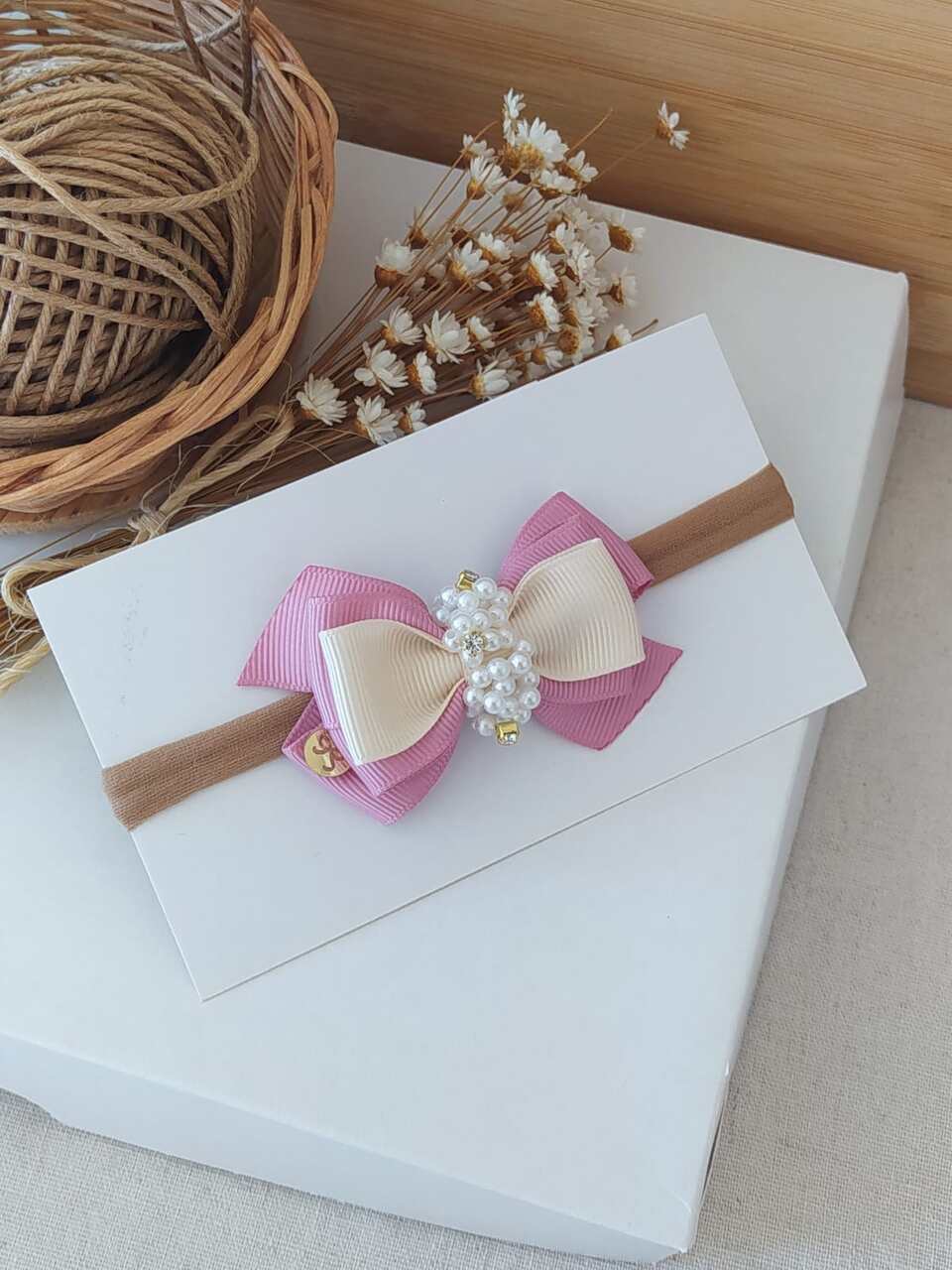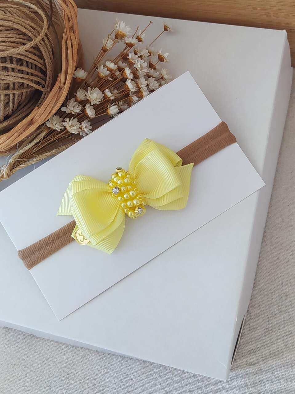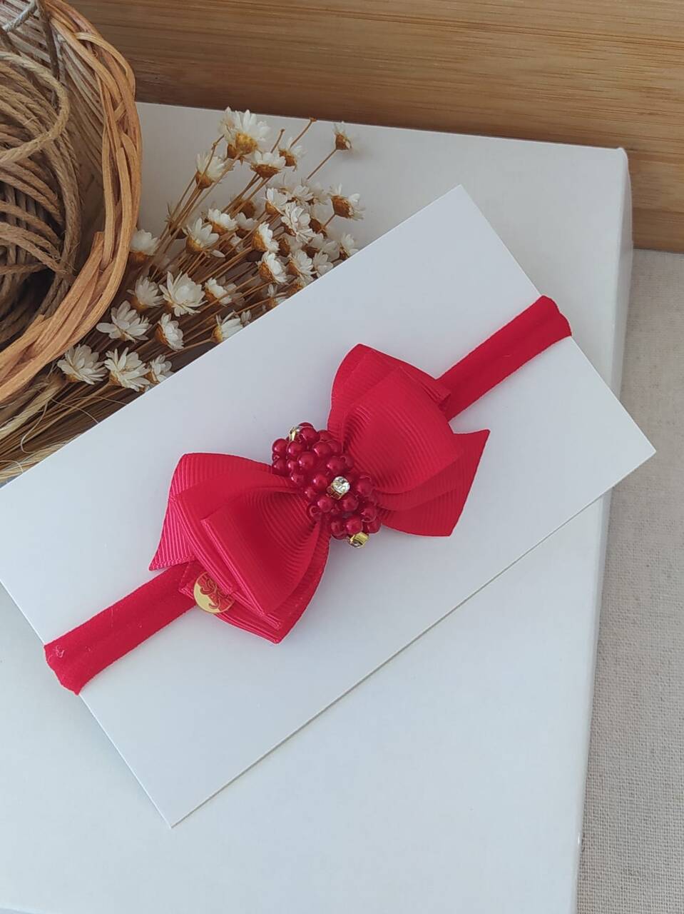 Laço em fita de gorgurão ,bordado a mão com pérolas e strass na faixa
