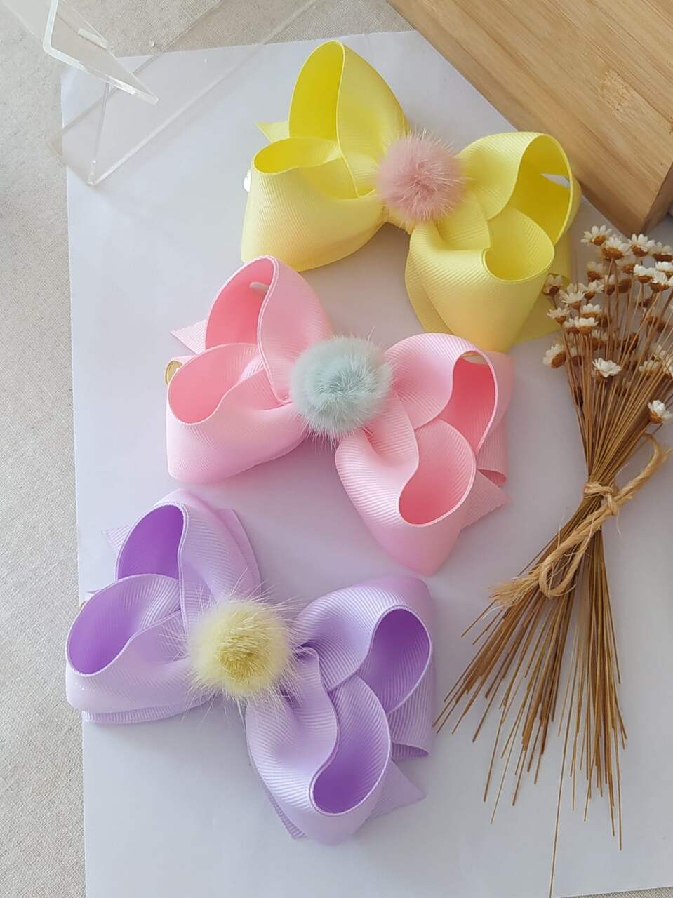 Laços em fita de de gorgurão, no bico de pato, com pompom de pelinho