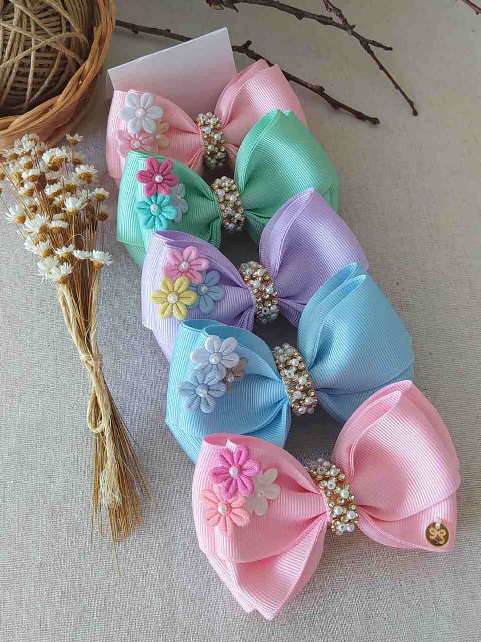Laços em fita de de gorgurão, no bico de pato, flor de tecido